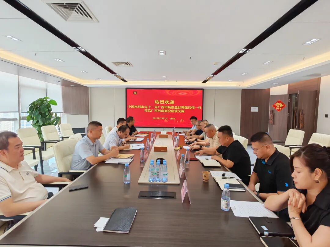 杜华勇引领嘉宾参观商会办公场所及设施。之后由蒋运俊主持召开座谈会。杜华勇代表商会介绍近年来商会建设发展成果。张伟伟总经理介绍了中国水利水电十一局海外内市场布局及广西市场部业务发展现状,并强调指出,广西市场部希望与广西河南商会广大会员企业加强沟通联系,寻找合作商机,携手拓展领域,共同开创业务发展新局面。宾主双方就围绕如何开展相互合作进行了深入、坦诚、友好的交流。